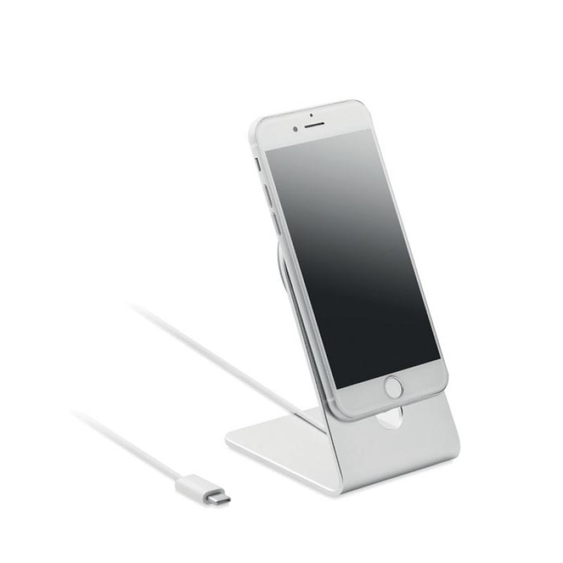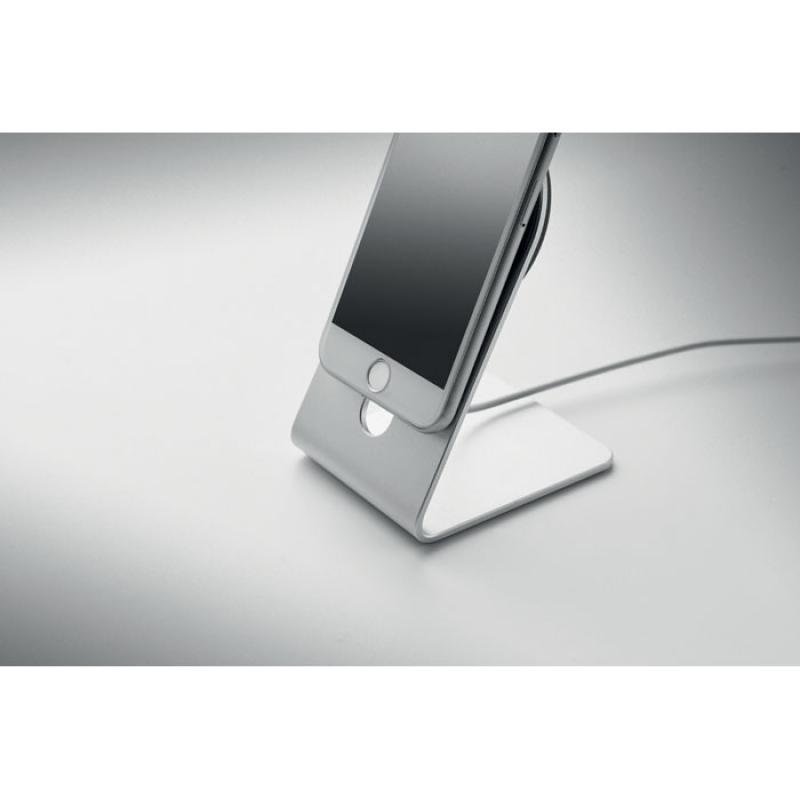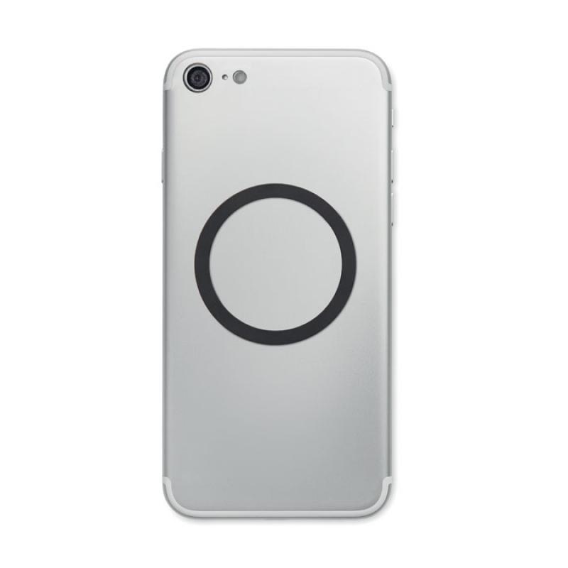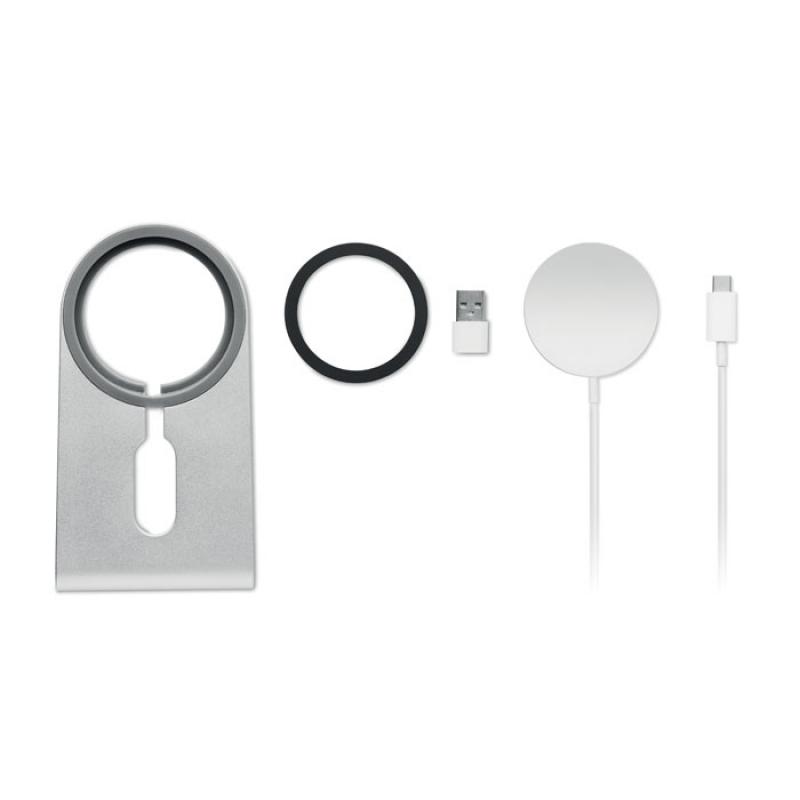 Cargador inalámbrico magnético de aluminio de 15W con soporte para teléfono. Incluye anillo metálico magnético adicional para la carga de otros teléfonos con carga inalámbrica no magnética. Salida: 9V/1.67A (15W) para una carga rápida. Compatible con los últimos Android, iPhone® 12 y más recientes.