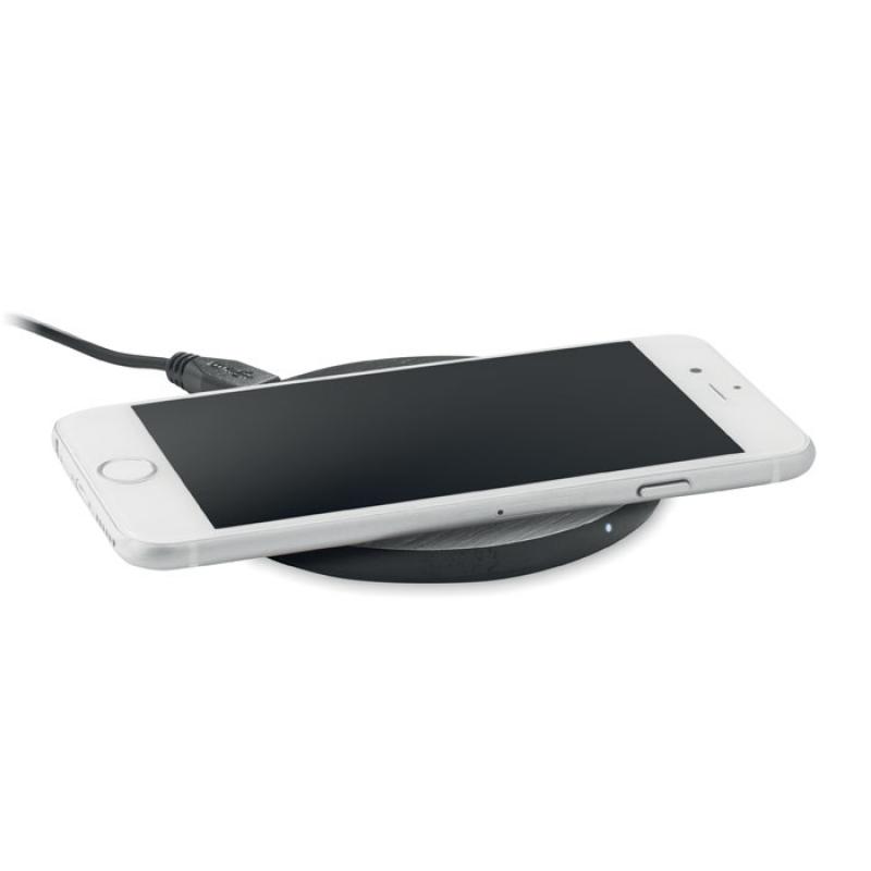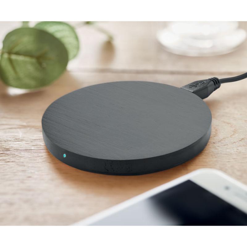Cargador inalámbrico de bambú. Conecte el dispositivo a su ordenador, coloque su teléfono encima y deje que se cargue. Durante la carga se enciende la luz azul. Output: DC5V/1A (5W). Compatible con todos los dispositivos dotados de tecnología Qi, como los últimos Android, iPhone® 8, X y más recientes. El bambú es un material natural, el color del articulo, la medida y la impresión sobre el puede variar.