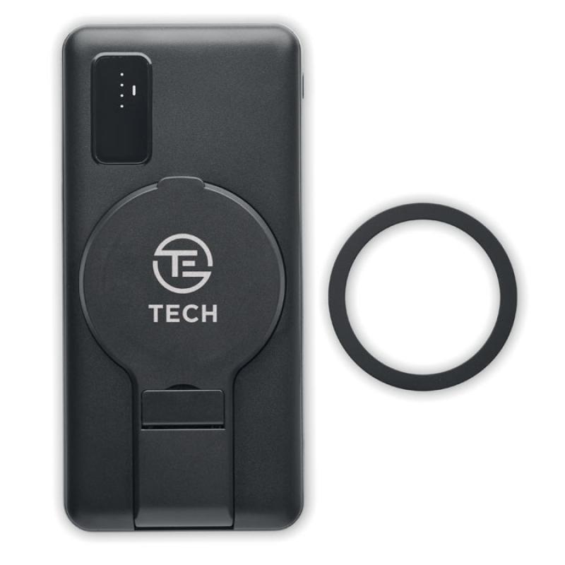 Cargador inalámbrico magnético (15 W) y power bank (10000 mAh) en ABS y soporte magnético para el teléfono. Entrada: micro B, Tipo-C. Salida 2x USB-A Entrada/Salida: Tipo-C. Salida: DC 9V/1.66A (15W) ideal para carga rápida. Compatible con iPhone® 12 y posteriores. Incluye anillo metálico magnético adicional para admitir la carga de otros teléfonos con carga inalámbrica no magnética. Tecnología PD (power delivery).Recipiente :
