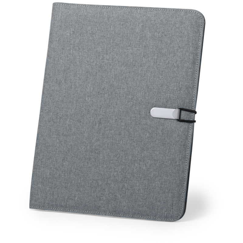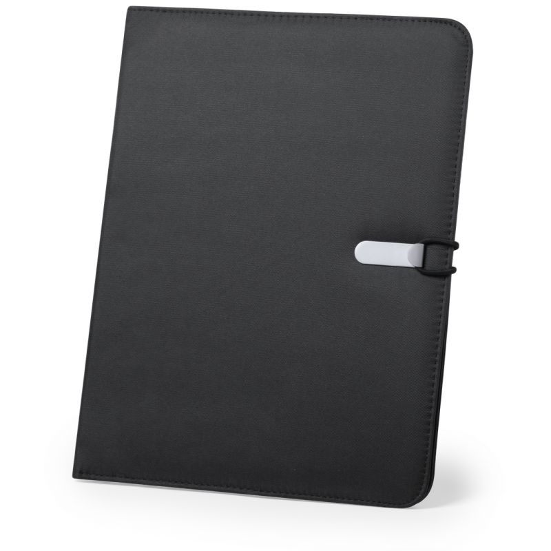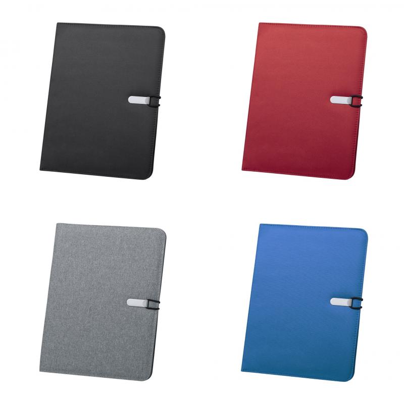 Elegante carpeta en vivos colores acabada en suave microfibra, con cierre metálico de elástico especialmente diseñado para marcaje en láser. Interior con bloc extraíble de 20 hojas lisas, 3 bolsillos de solapa, tarjeteros y soporte para bolígrafo.