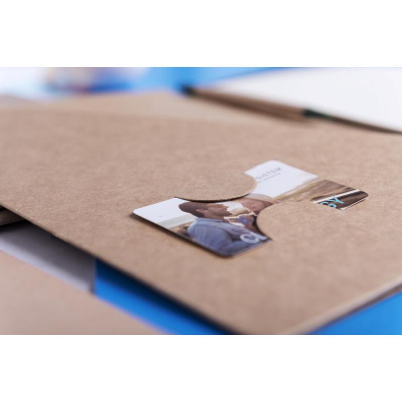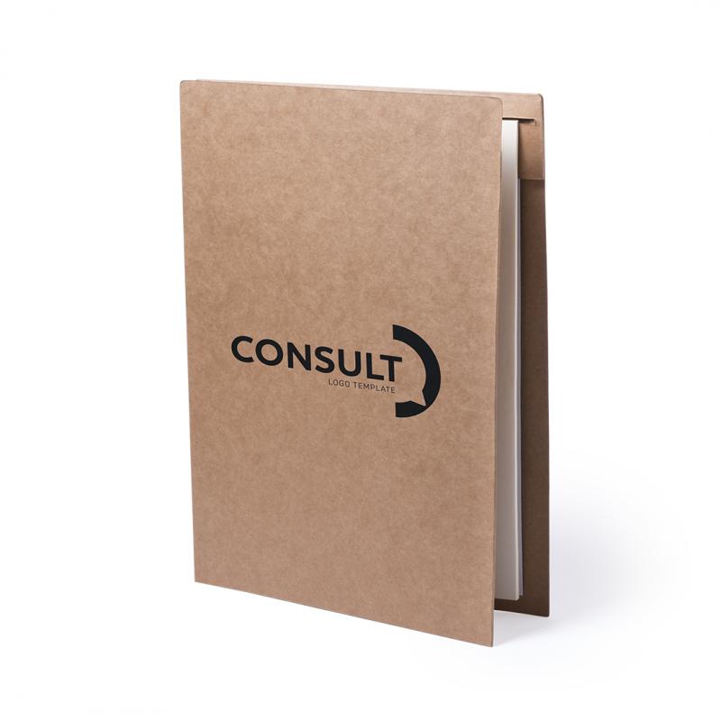 Carpeta en resistente cartón reciclado de acabado rígido con bolígrafo de cartón reciclado a juego incluido. Interior con bloc extraíble de 20 hojas lisas, bolsillo de solapa, tarjetero y soporte para bolígrafo.