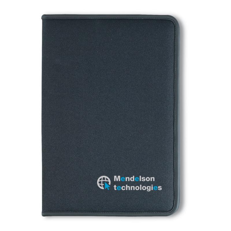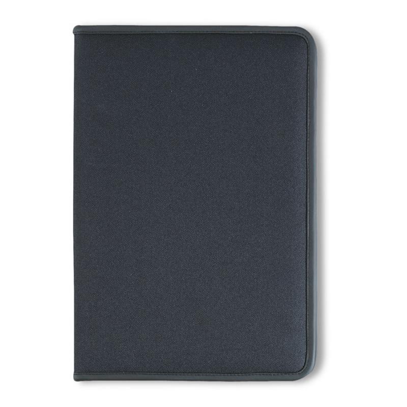 Porta documentos A4 con cremallera, 4 compartimentos y porta tarjetas. Incluye bloc de notas de 20 hojas. Material poliéster 600D, forro 210T.