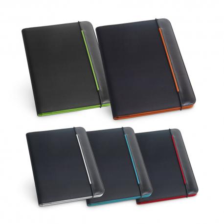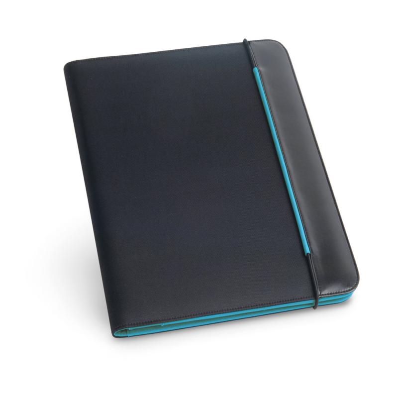 Carpeta A4 hecha en polipiel y 800D con interior de microfibra. La carpeta dispone de un elástico para cerrar, un bloc de 20 hojas pautadas, 3 bolsillos y soporte para bolígrafo (no incluido).245 x 315 x 15 mm