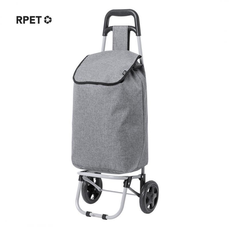 Carro de compra plegable y línea nature. Fabricado en resistente poliéster 600D RPET, elaborado a partir de plástico reciclado, para así fomentar la reutilización de residuos plásticos y ayudar a la sostenibilidad del planeta. Con asa reforzada, cuerpo metálico tubular, bolsillo de cremallera posterior y soportes con gomas de protección. Ruedas reforzadas de alta calidad. Etiqueta distintiva RPET en la solapa.