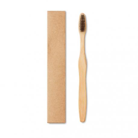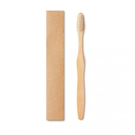 Cepillo de dientes con mango de bambú y cepillo de nilón. Presentado en caja de kraft. El bambú es material natural, el color del articulo puede variar.