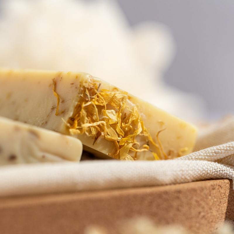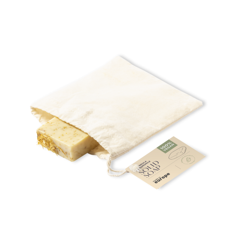 Pastilla de jabón vegano de 100 gr. Aroma de caléndula y manzanilla con propiedades calmantes, hidratantes y reparadoras. Dermatológicamente testado y de fabricación europea. Presentación en bolsa individual de algodón, con cierre de cordón y etiqueta distintiva. Producto sostenible y 100% vegano, sin ingredientes de procedencia animal. Además, no se han realizado pruebas de estos productos en animales, promoviendo el cuidado y respeto de todos ellos.