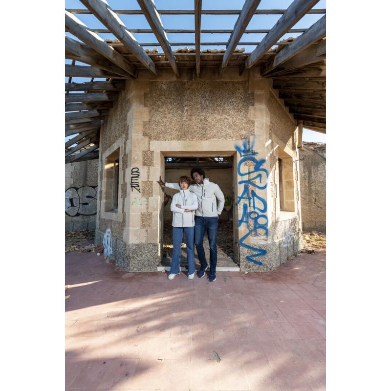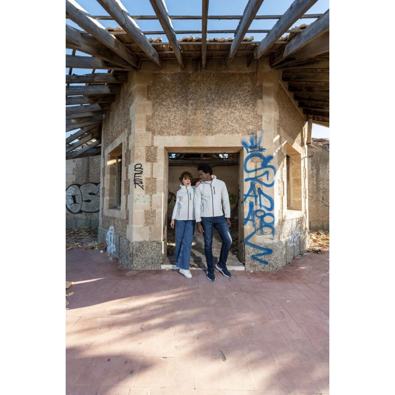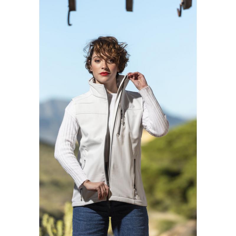 Chaleco impermeable y transpirable en material soft shell de 300g/m2. De elegante diseño bicolor, en color blanco con contraste de detalles en gris. Cierre de cremallera y bolsillos frontal y laterales de cremallera. Disponible en tallas S, M, L, XL, XXL.