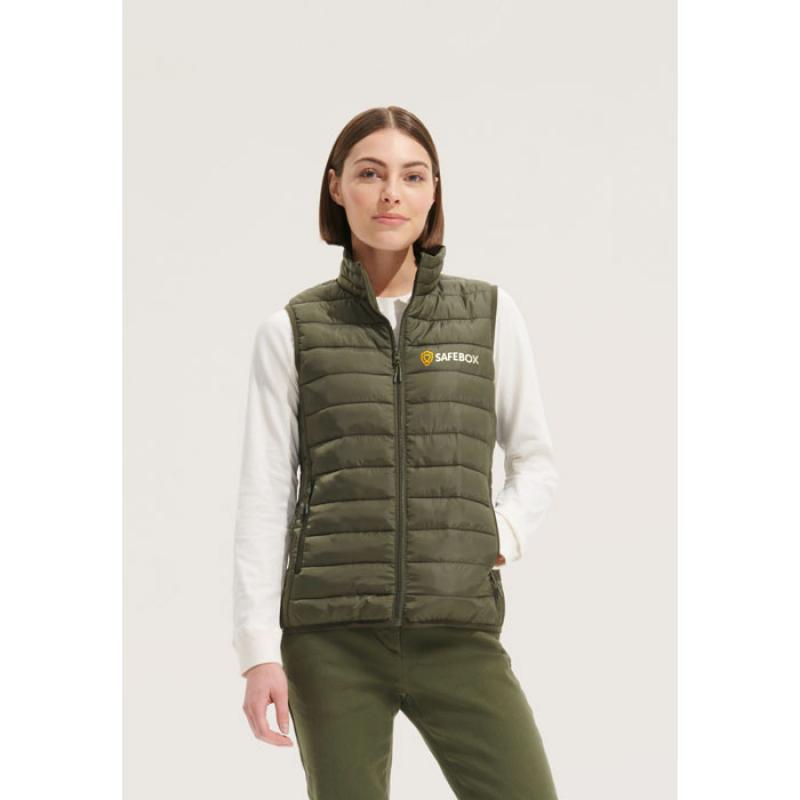 SOL'S STREAM BW WOMEN, MUJER, chaleco ligero tejido exterior y forro: 100% poliéster, acolchado: Plumón 100% poliéster. Cierre frontal y bolsillos laterales con cremallera de nailon a tono. Deslizadores de metal tono sobre tono con tiradores de cremallera negros de fantasía. Cuello alto y bies elástico a tono en las sisas y el dobladillo. Se suministra con bolsa de almacenamiento. Para la correspondencia de tallas, consulte la tabla de tallas en la sección de documentación del producto.Recipiente :
