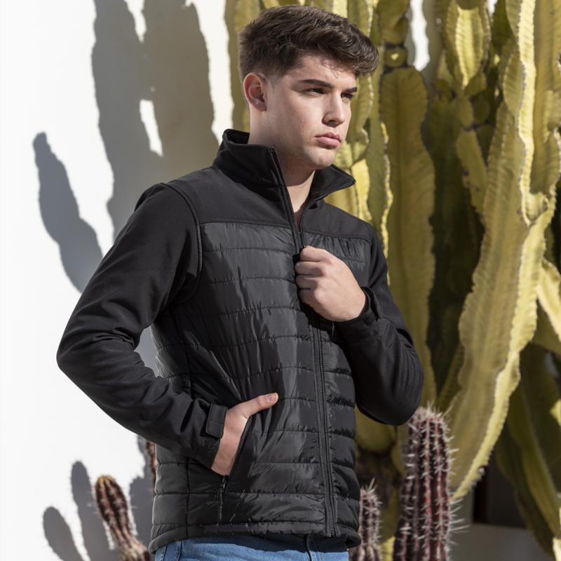 Chaqueta impermeable y transpirable en combinación de materiales soft shell y poliéster. De elegante construcción en color negro, con cierre de cremallera y bolsillos laterales de cremallera con tiradores para fácil apertura. Puños ajustables y disponible en tallas S, M, L, XL, XXL.