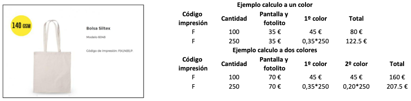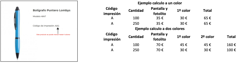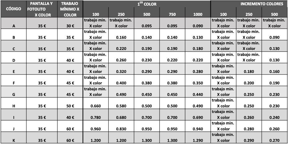 Para que tengas una referencia del coste del marcaje detallamos una tabla con las tarifas de marcaje en función del código de impresión y unidades a marcar. Siempre te enviaremos presupuesto por escrito con el coste del producto y el coste de marcaje.