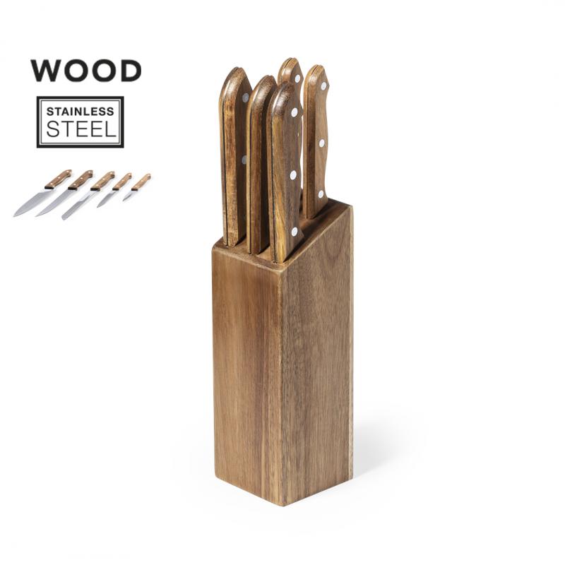 Completo tacoma con base fabricada en resistente madera natural de acacia. Incluye 5 cuchillos en distintos tamaños y para distintos usos, fabricados en acero inox, con mango en madera de acacia. Presentación en caja individual de diseño kraft