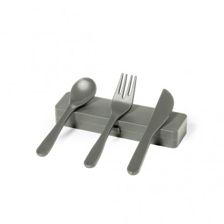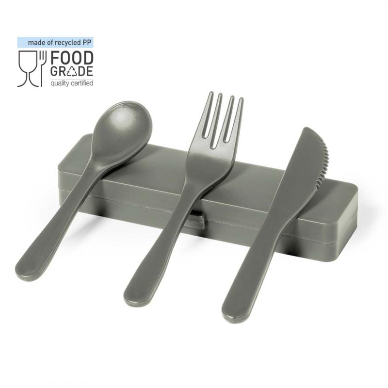 Set de cubiertos fabricados en PP reciclado libre de BPA, con estuche de presentación a juego. Incluye cuchara, tenedor y cuchillo. Dispone de Certificación Food Grade, garantizando la seguridad cuando los alimentos entran en contacto con el material usado para fabricar el producto. Estuche esterior y cubiertos en acabado mate disponibles en variada gamas de colores. Presentados en bolsa individual reciclada.El PP reciclado es un plástico reciclado y altamente reciclable, de gran resistencia y apto para multitud de aplicaciones.