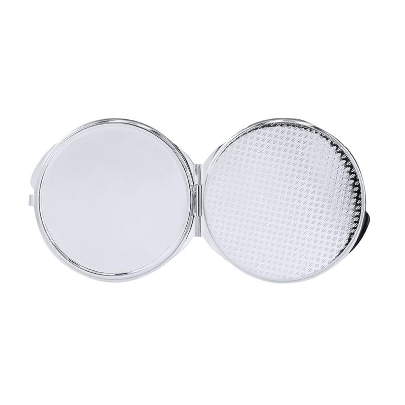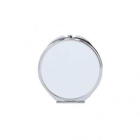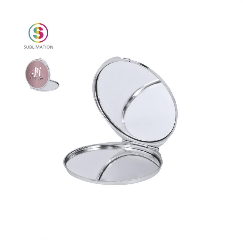 Espejo plegable metálico con placa para sublimación (no integrada en el producto, ideal para imprimir y pegar posteriormente). Con dos espejos interiores: 1X y aumento 2X.