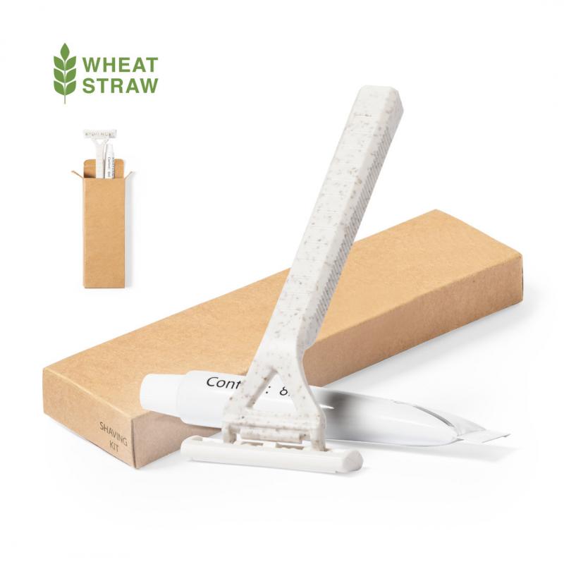 Set de afeitado con cuchilla y gel de afeitar. Contenido: Cuchilla de afeitar de doble hoja con cuerpo fabricado en en caña de trigo, para así fomentar la utilización de materias primas naturales y reducir las emisiones contaminantes. Gel de afeitar en tubo de 8 gr, con tapón a rosca.Set presentado en caja individual de diseño kraft.