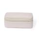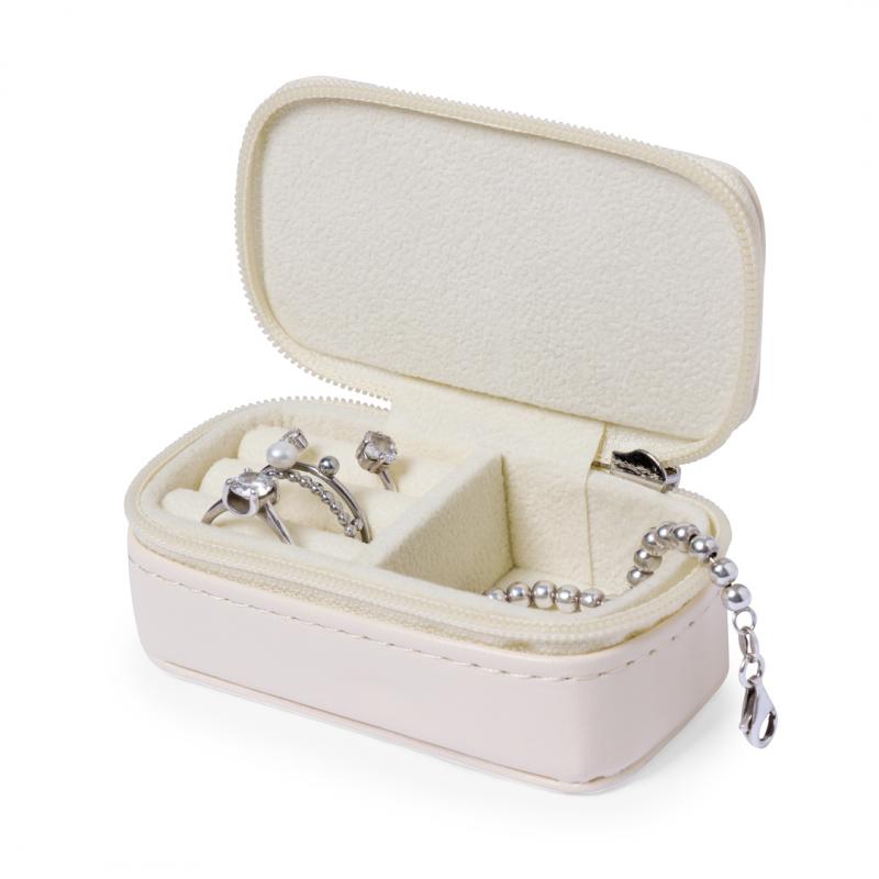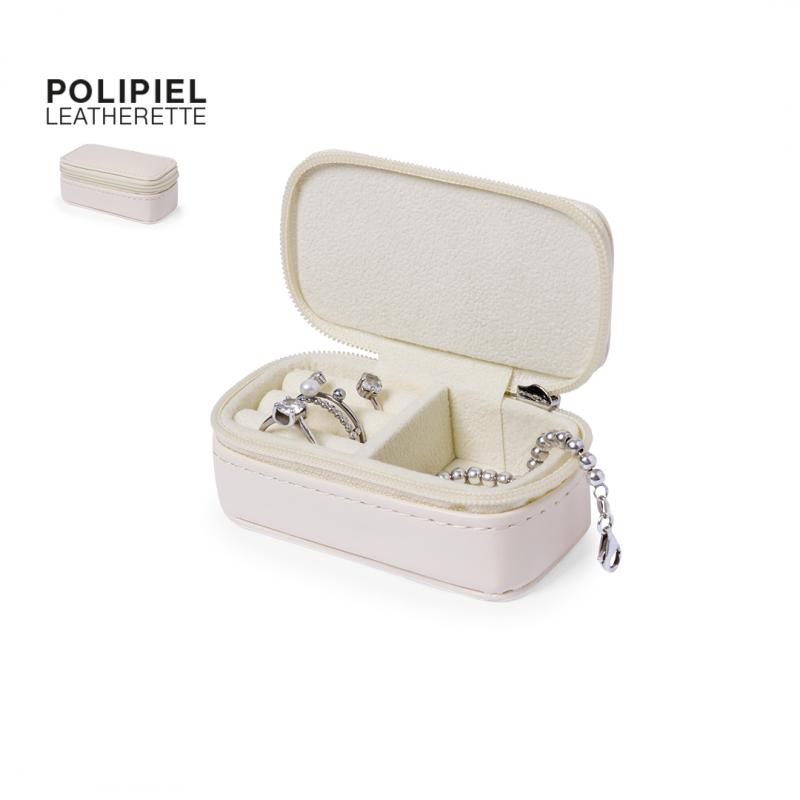 Estuche joyero fabricado en polipiel. Diseño de color natural con cierre de cremallera y dos compartimentos en su interior. Un compartimento en forma de cajita y otro compartimento con almohadillas para sujetar anillos y pendientes, forrado de suave tela. Presentado en una bolsa de papel individual.