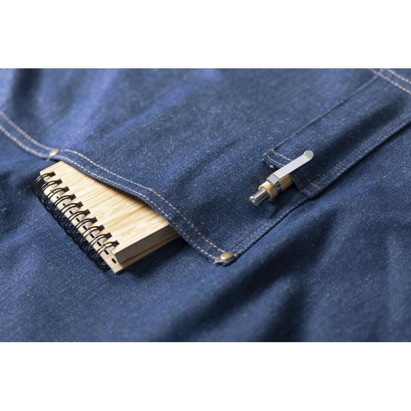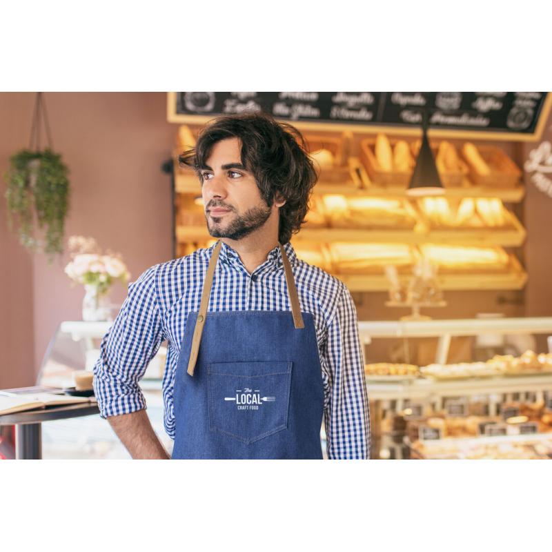 Delantal de alta calidad en resistente tela de acabado denim. De corte por debajo de la rodilla, con cinta de cuello ajustable por botón, cintas para la cintura en color marrón, reforzadas. Incluye multitud de bolsillos para llevar cómodamente los distintos utensilios, con costuras reforzadas y remaches metálicos.