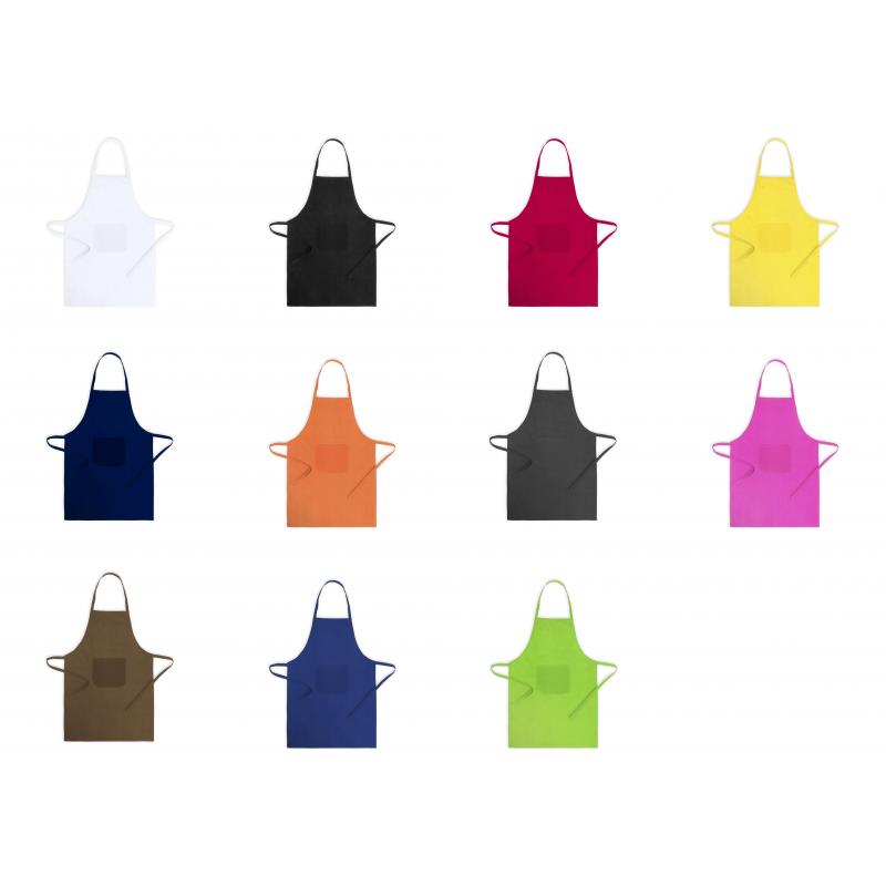Delantal fabricado en tejido TC, combinación de algodón y poliéster. En el frontal incluye un práctico bolsillo, con cordones ajustables en la cintura y corte por debajo de la rodilla. Disponible en amplia gama de colores.