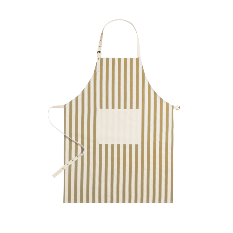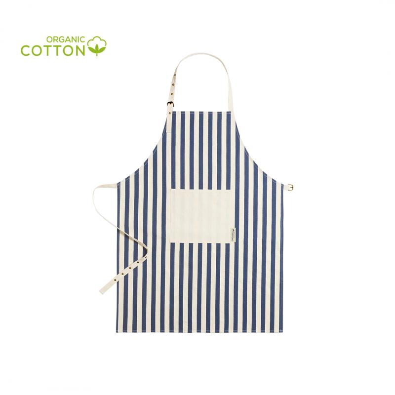 Delantal de línea nature fabricado en material 100% algodón orgánico, cultivado usando métodos sostenibles, sin insecticidas, fertilizante u otros productos químicos, favoreciendo así el cuidado del medio ambiente. Con certificación GOTS (Global Organic Textile Standard, ó Norma Mundial de Textiles Orgánicos) que garantiza que los tejidos están hechos de fibras orgánicas. De innovador diseño a rayas verticales, con bolsillo frontal en color natural y de corte por debajo de la rodilla. Ajustable, con cintas en cuello y cintura. Distintivo algodón orgánico en etiqueta.