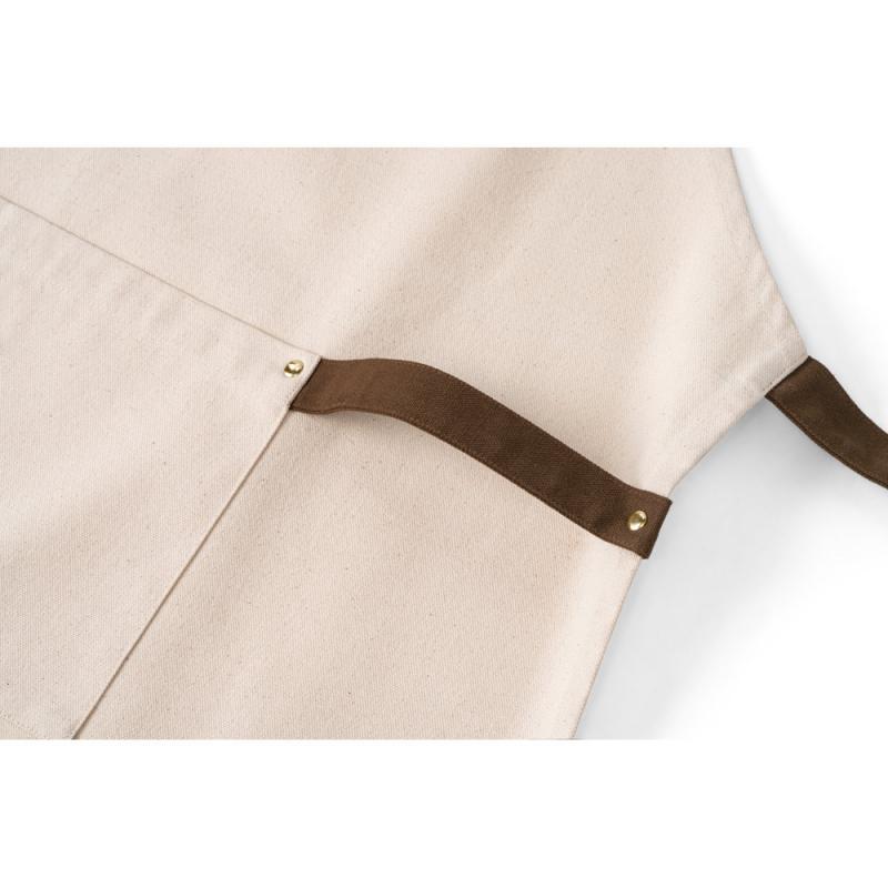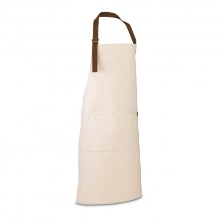 Delantal de lona 100% algodón (320 g/m²) con detalles metálicos. Con 3 bolsillos multifuncionales y una tira lateral (para colgar un paño de cocina). Cinta para el cuello fácilmente ajustable. Se suministra en caja de regalo en kraft. 680 x 900 mm