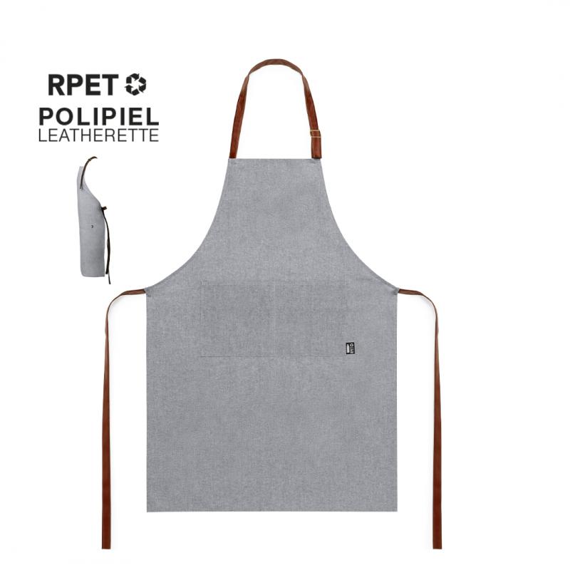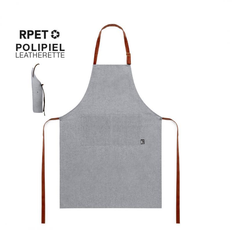 Delantal de línea nature en material RPET, elaborado a partir de plástico reciclado, para así fomentar la reutilización de residuos plásticos y ayudar a la sostenibilidad del planeta. De corte por debajo de la rodilla, con cintas de ajuste en resistente polipiel y amplio bolsillo frontal. Etiqueta en bolsillo con distintivo RPET.