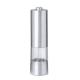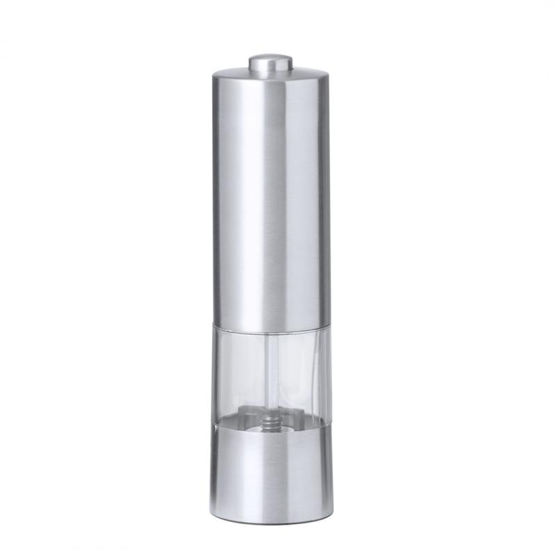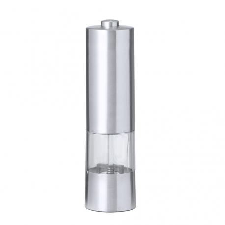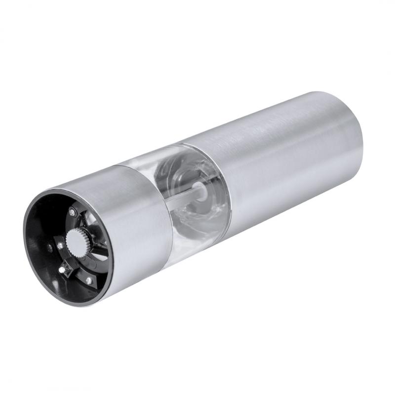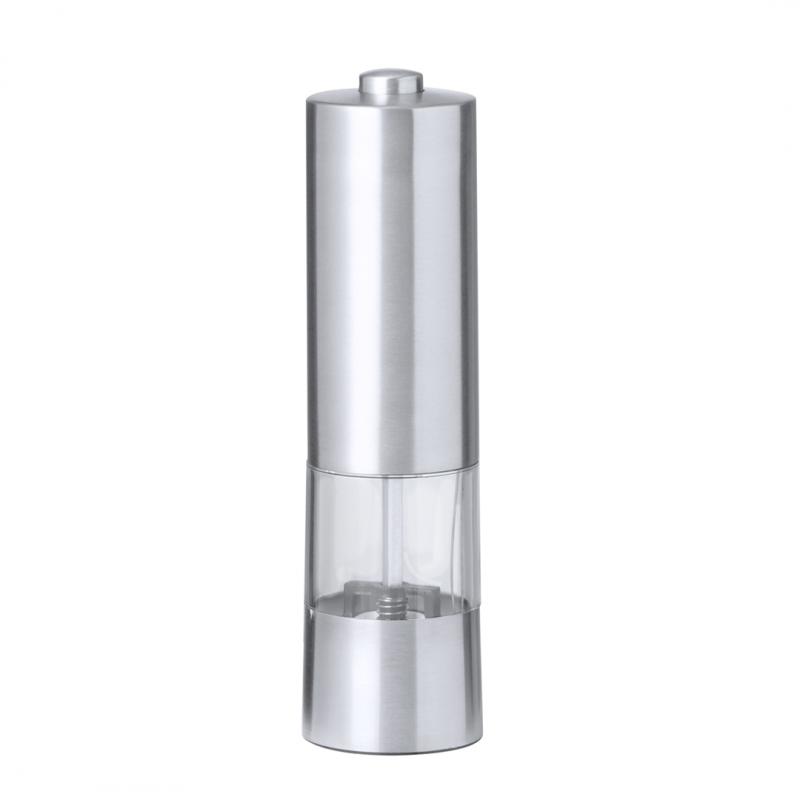 Molinillo eléctrico para sal y pimienta en acero inox. Ideal para agregar la especia más deseada en compartimento de 70 ml, condimentando al pulsar el botón superior pudiendo ajustar el tamaño del grano. Equipado con una ventana para visualizar la cantidad de especia que queda y con luz LED. Alimentado por 4 pilas AAA (no incluidas) y presentada en caja de diseño kraft.