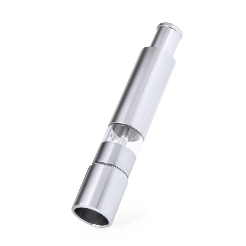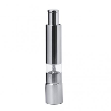 Molinillo manual para sal y pimienta fabricado en aluminio. Ideal para agregar la especia más deseada y utilizar con el picador manual en forma de pulsador. Cuenta con una ventana para visualizar el nivel. Presentado en caja de diseño kraft.