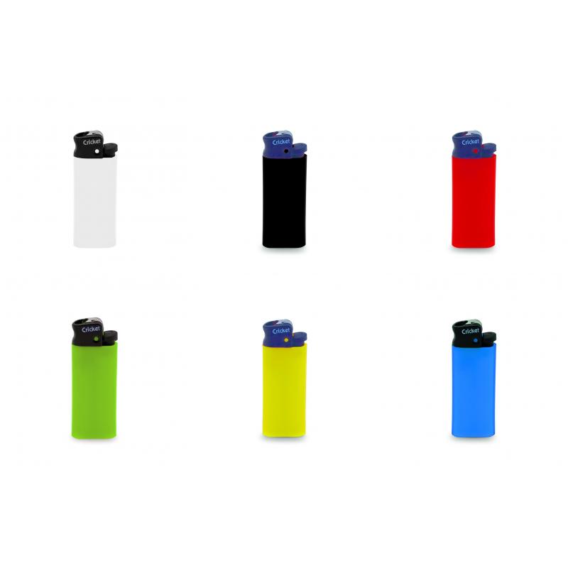 Miniencendedor clásico Cricket. A gas, de mecanismo de piedra y con protección infantil. Disponible en variada gama de colores sólidos. Servido en bandejas de 50 unidades del mismo color.