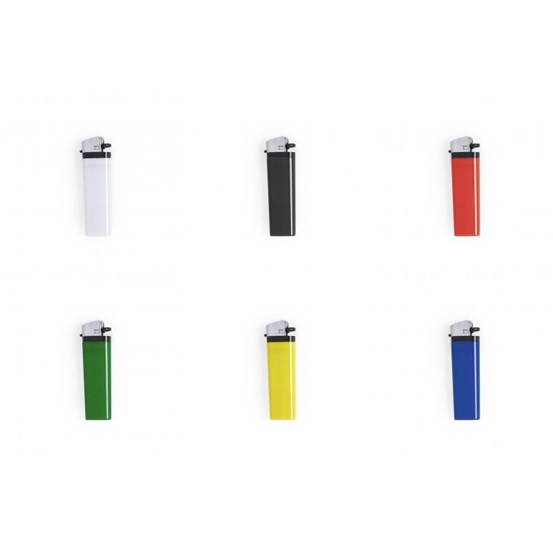 Encendedor a gas de mecanismo de piedra. Con protección infantil y regulador de llama. Disponible en variada gama de colores de acabado sólido. Servidos en bandejas de 50 unidades del mismo color.
