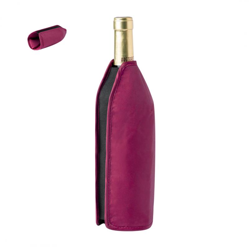 Enfriador de botellas de práctico diseño. Adaptable a cualquier tipo de botella mediante su banda elástica negra que va desde la parte superior a la inferior. Es perfecto para meter en el congelador y mantener la temperatura de la botella durante más tiempo. Disponible en variada gama de colores y presentado en una bolsa de papel reciclada.