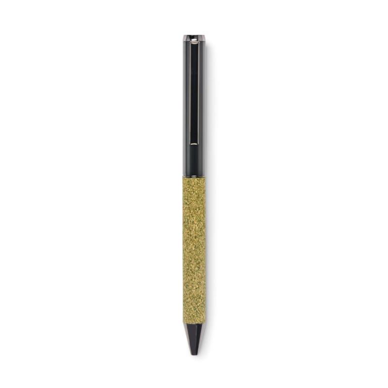 Bolígrafo de metal giratorio con cuerpo de tela fabricado con un 20% de posos de té, un 30% de corcho y un 50% de tela de poli algodón en caja de cartón. Tinta azul.Recipiente :