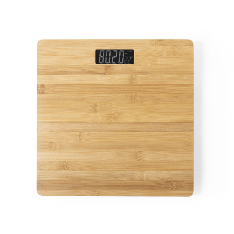 Báscula de línea nature en bambú, con base antideslizante. Display digital, con funciones de apagado automático, temperatura, tara y selección de unidad de pesaje. Alimentación a pilas (2xAAA no incluidas). Presentada en atractiva caja de diseño eco.
