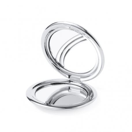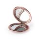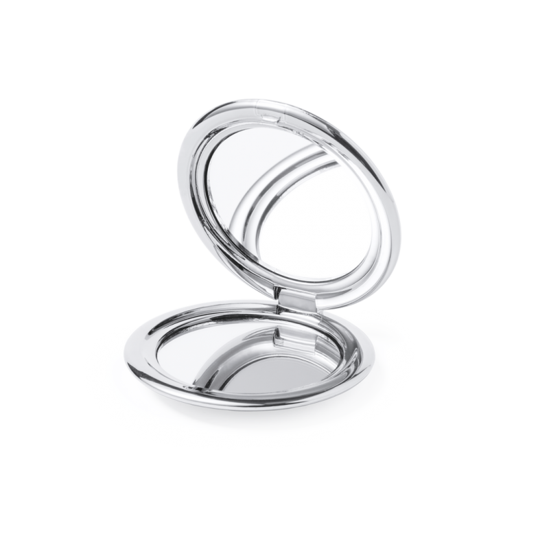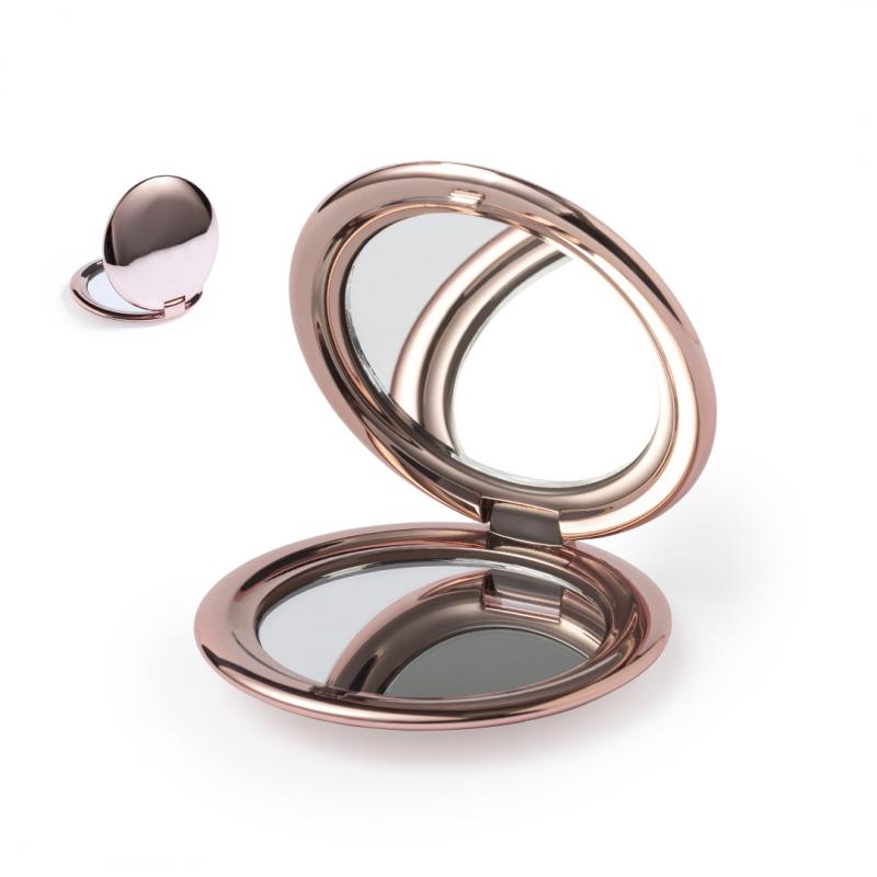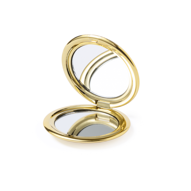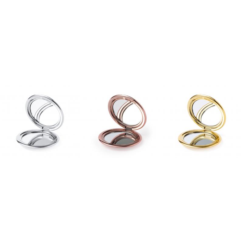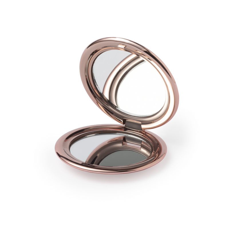 Espejo plegable en elegante acabado metalizado. Con dos espejos interiores (1X y aumento 2X), disponible en colores dorado, plateado y oro rosa.