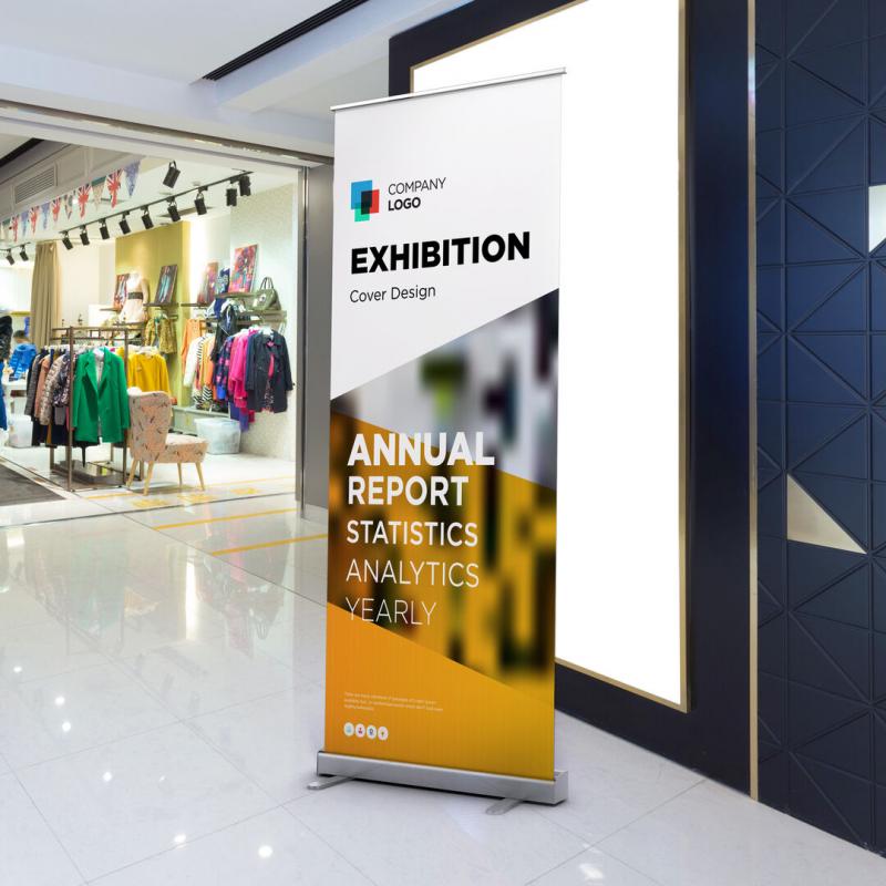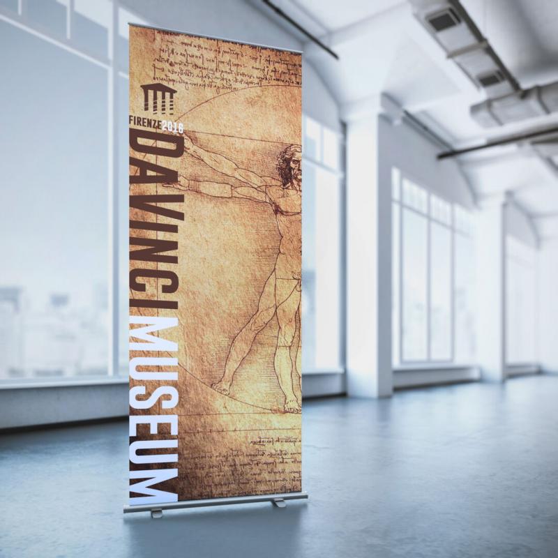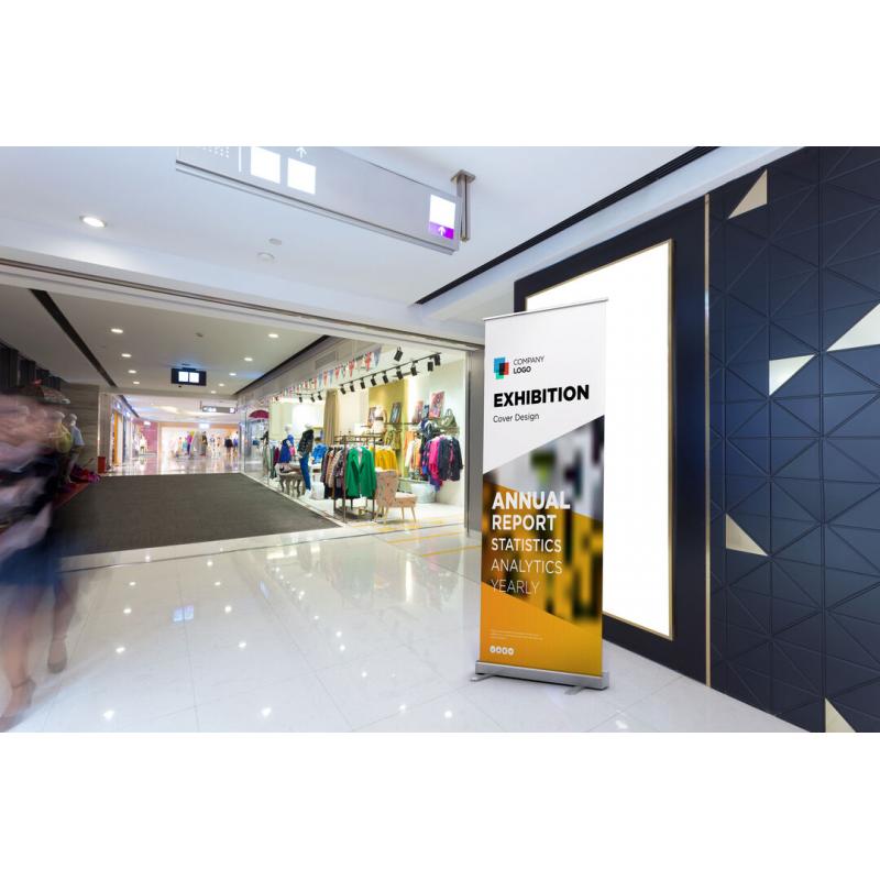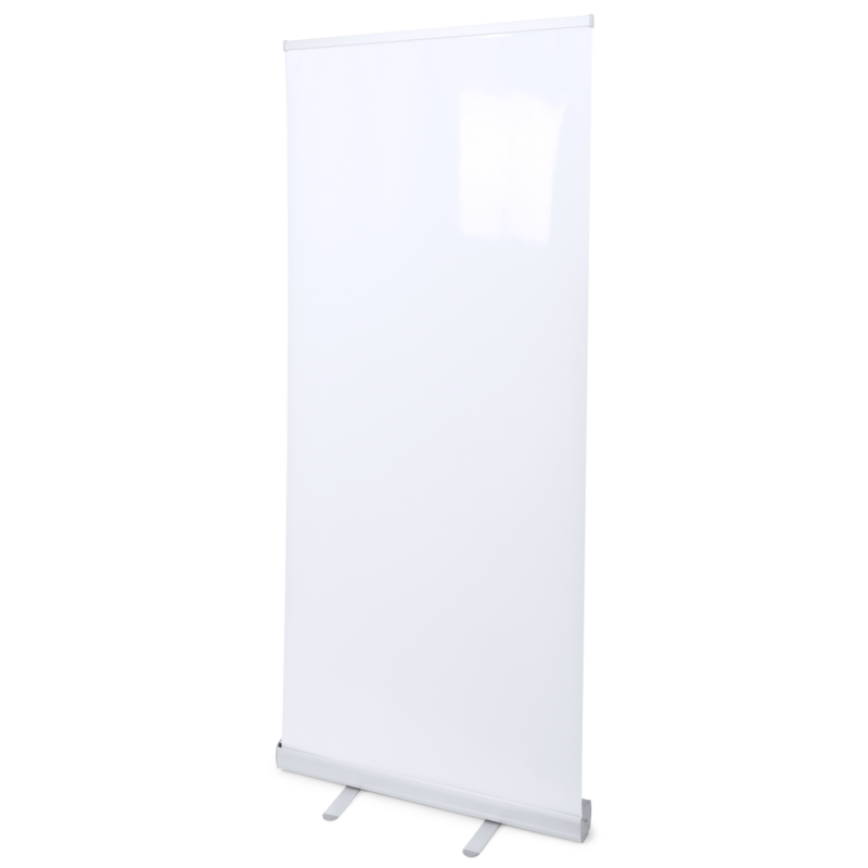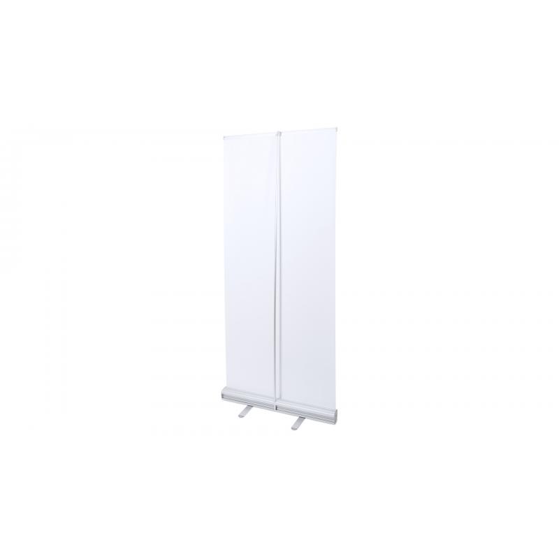 Panel de impresión roll up de 85x200cm en resistente polipropileno de alta densidad especialmente diseñado para marcaje a todo color. Con soportes de aluminio y gancho de sujeción. Presentación enrollado en funda de tela.