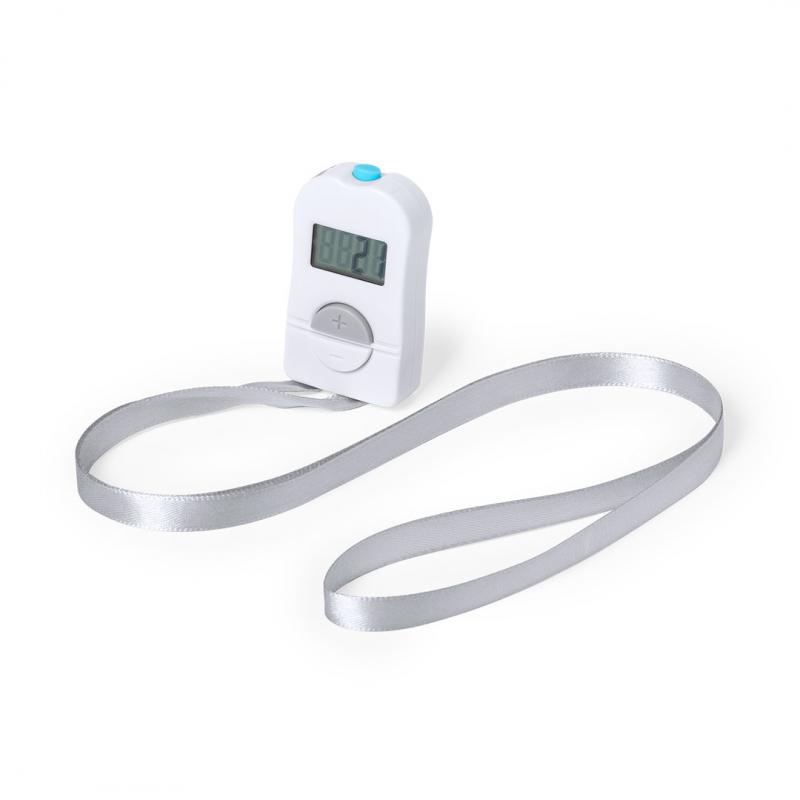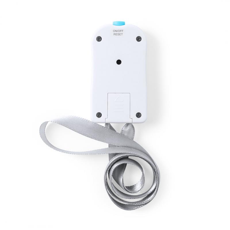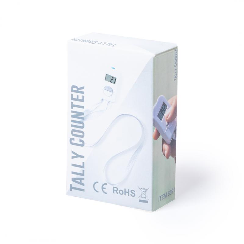 Contador de aforo digital fabricado en resistente material ABS de acabado brillo, con práctica cinta de poliéster y amplios pulsadores para añadir o restar aforo. Pantalla digital con contador de 4 dígitos y botón de reinicio en parte superior. Amplia superficie para logotipo, especialmente diseñado para marcaje en tampografía. Presentado en atractiva caja individual de diseño. Alimentación a pilas, de botón incluida.