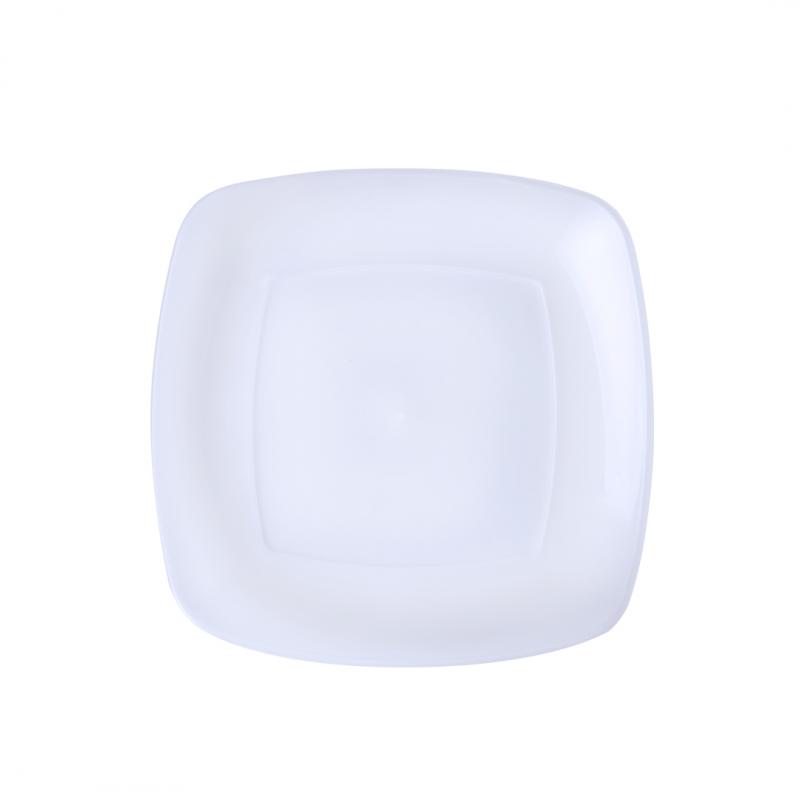 Plato plano en resistente y flexible material PP. Reutilizable y en acabado translúcido cuadrado.