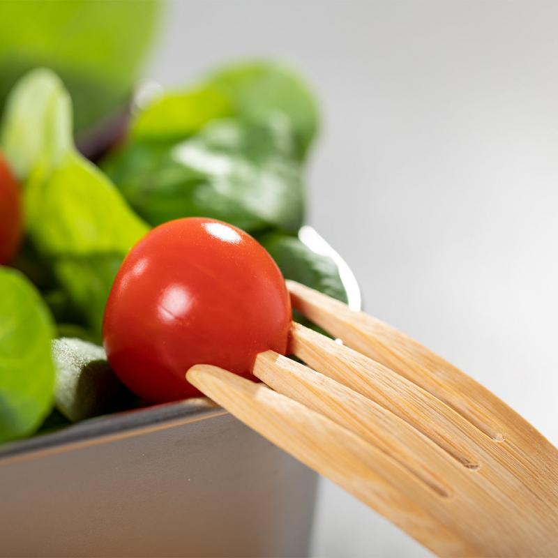 Fiambrera de línea nature. Tapadera y cubiertos fabricados en bambú, con compartimento principal en acero inox de 600 ml de capacidad. Incluye cinta de seguridad con tenedor + cuchillo y tapa hermética con banda de goma. Presentada en atractiva caja individual de diseño nature.