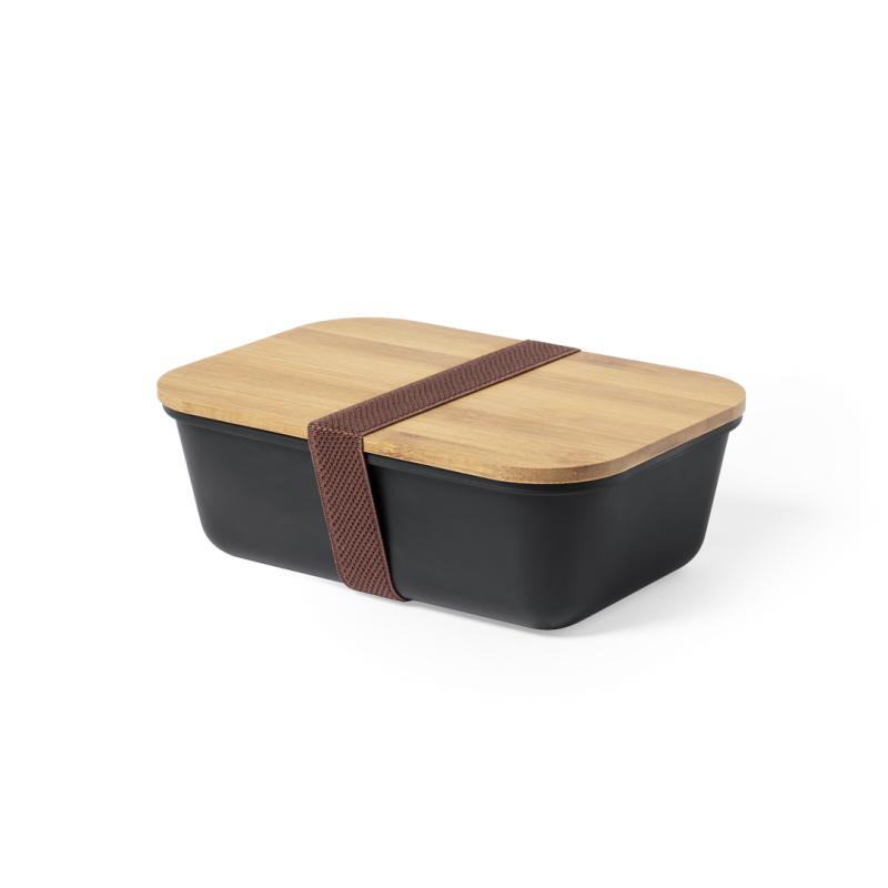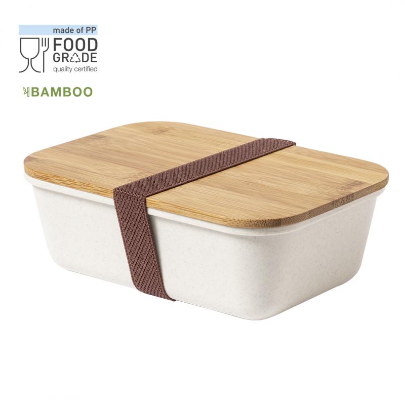 Fiambrera de 1l en resistente material PP veteado libre de BPA, con tapa de bambú. Cinta elástica de seguridad en tapa y certificación Food Grade, garantizando la seguridad cuando los alimentos entran en contacto con el material usado para fabricar el producto.