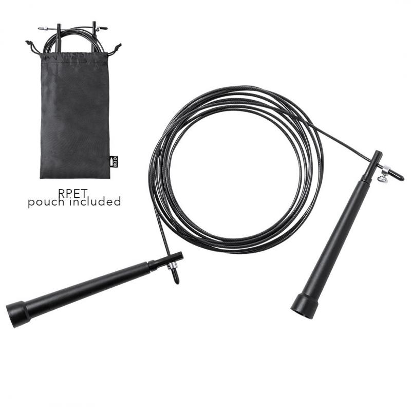 Comba de calidad premium, con cuerda extra larga ajustable de 3m de largo y fabricada en acero con cobertura de resistente PVC. Con mangos de sujeción ergonómicos y presentada en funda de poliéster RPET con cierre de cordón, elaborada a partir de plástico reciclado para así fomentar la reutilización de residuos plásticos y contribuir a la sostenibilidad del planeta. Etiqueta distintiva RPET en la funda.