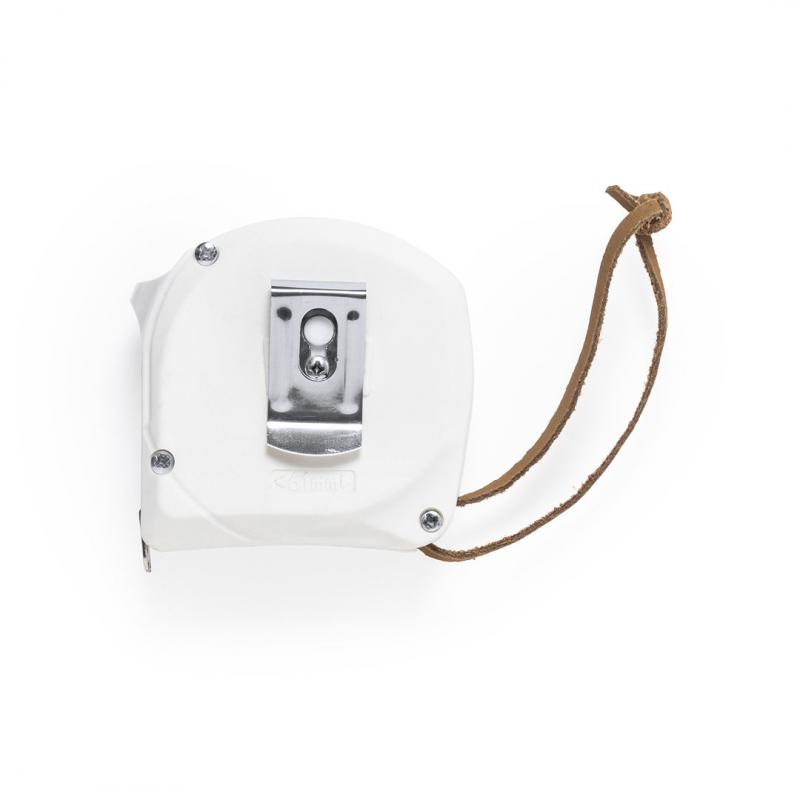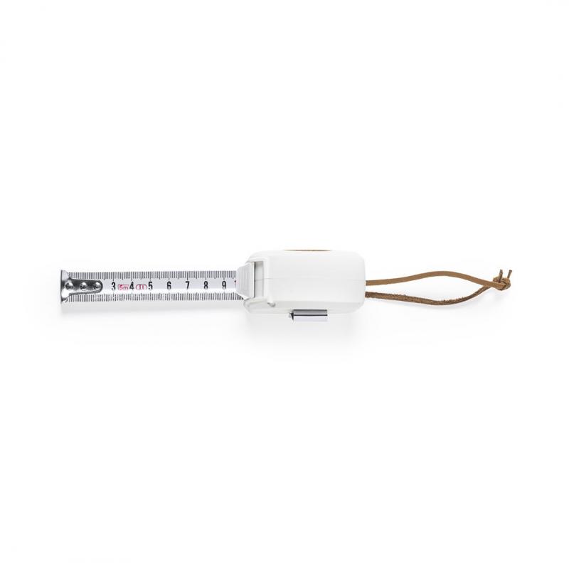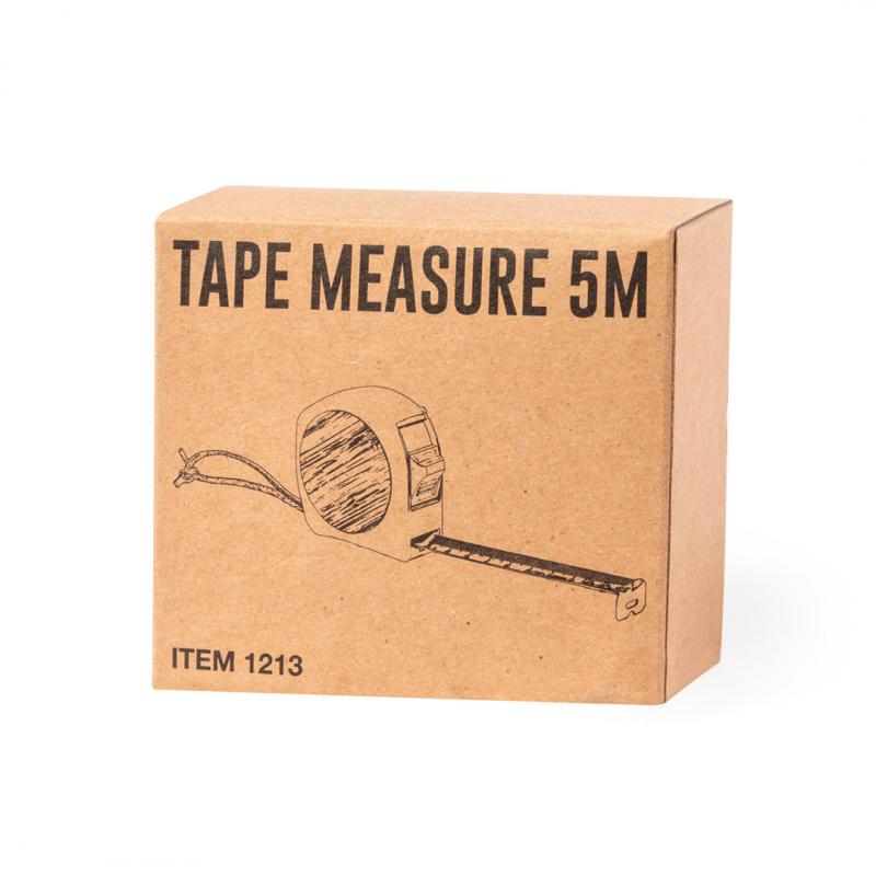 Flexómetro de 5 metros de línea nature, fabricado en combinación de bambú y ABS con tacto goma. Hoja metálica con freno, clip metálico para cinturón y cinta de transporte en PU. Con amplia superficie de marcaje y presentado en atractiva caja de diseño eco.