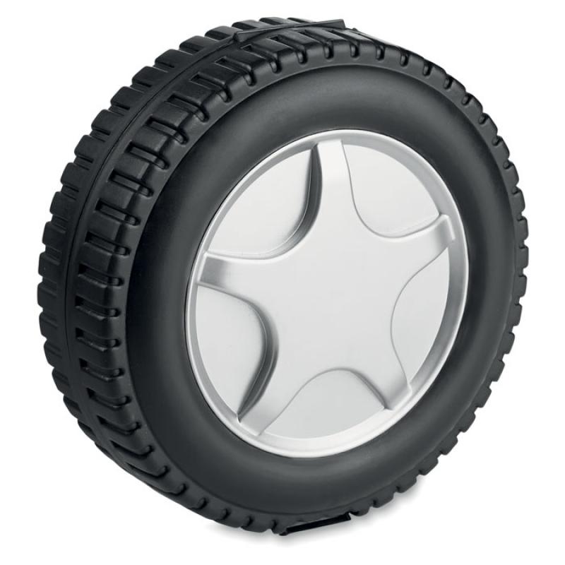 Set de 25 herramientas en forma de neumático. Incluye destornilladores de precisión, 5 adaptadores, alicates, llaves hexagonales, 10 cabezales, flexómetro, etc.