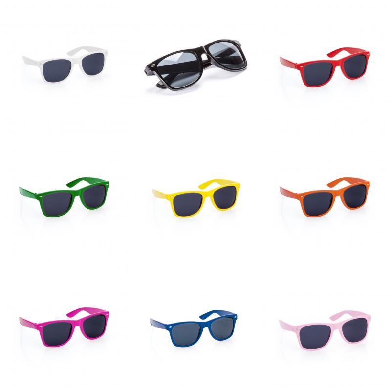 Gafas de sol con protección UV400. Motura resistente con diseño elegante y acabado brillante, en divertidos y variados colores. Las lentes son de color negro para garantizar estilo. Presentado en una bolsa individual reciclada.