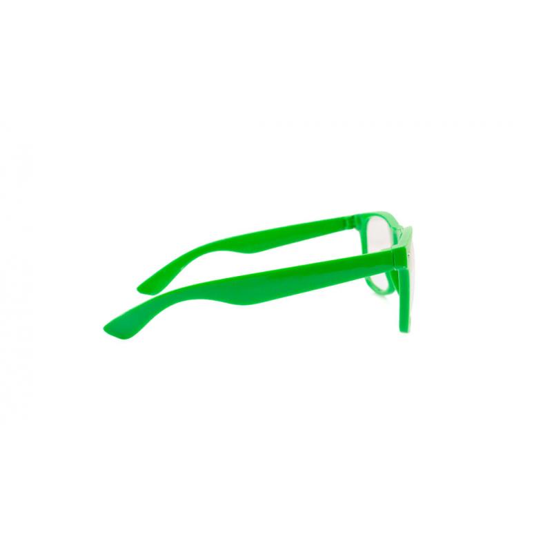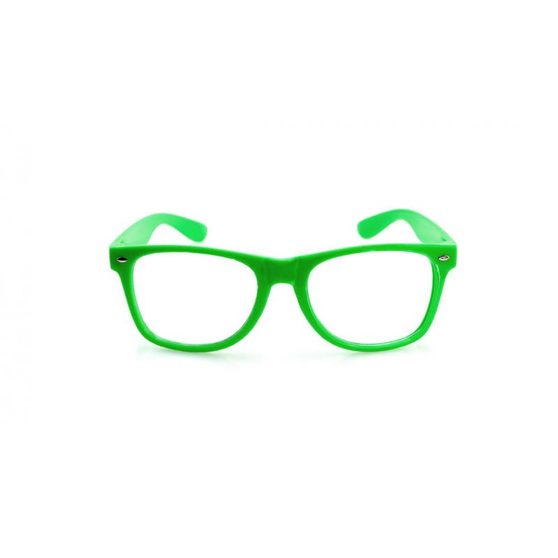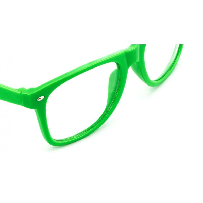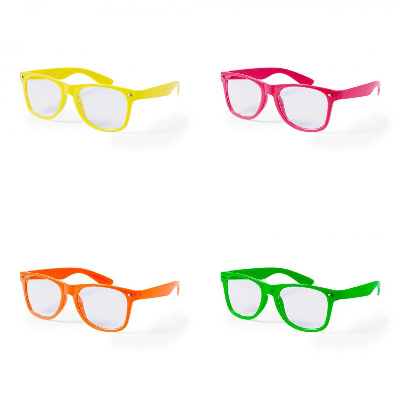 Divertidas gafas de clásico diseño con lentes transparentes y brillante montura en variada gama de vivos colores fluorescentes.