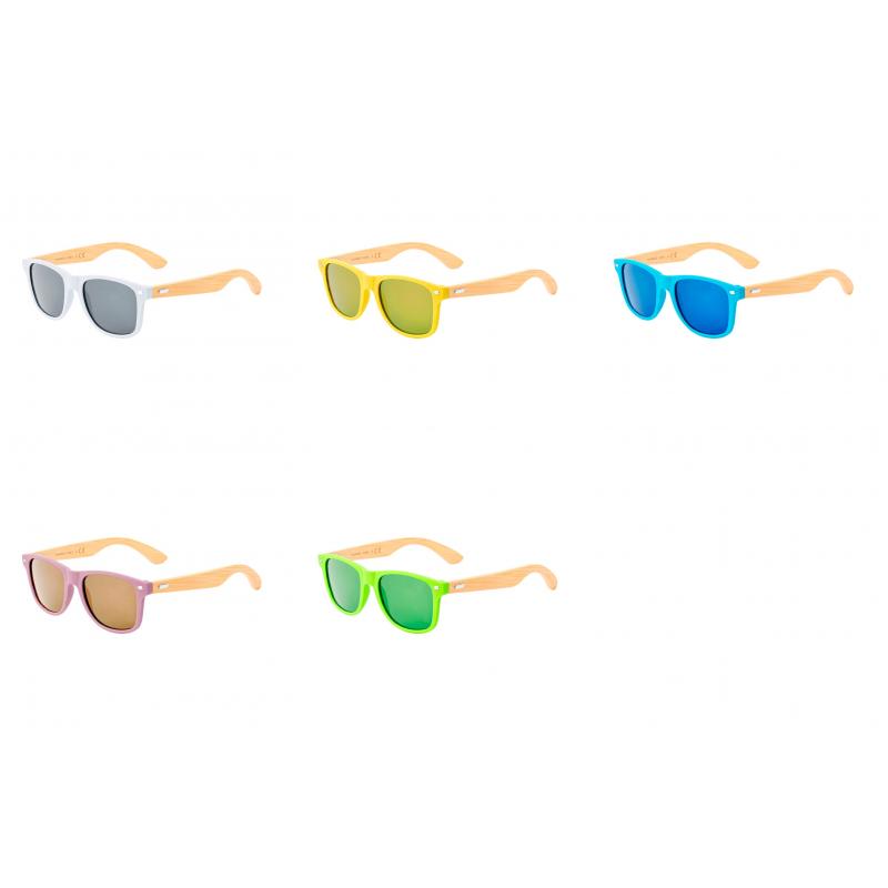 Gafas de sol fabricadas en bambú con protección UV400. Montura de colores en resistente material PC y patillas en bambú. Lentes AC (acetato de celulosa) de acabado espejo, disponibles en variada gama de colores en combinación con la montura. Presentada en atractiva bolsa de papel diseño kraft.Materiales como el bambú fomentan la utilización de materias primas naturales, reduciendo las emisiones contaminantes. Proviene de una planta de gran resistencia y versatilidad, con crecimiento y regeneración rápidos, siendo una excelente alternativa al uso de madera tradicional.