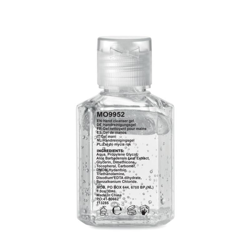 Gel de manos en botella de material PET con dosificador. Capacidad 30ml. Sin alcohol. Contiene cloruro de benzalconio. Este producto está clasificado como artículo cosmético.