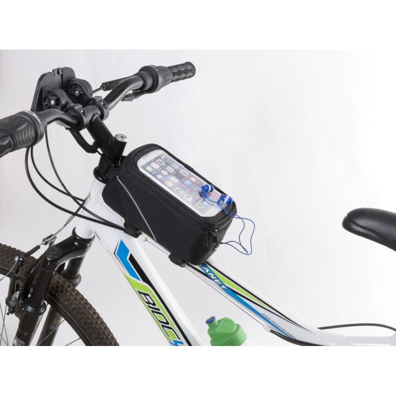 Bolsa multiusos para bicicleta en resistente poliéster 600D con acolchado y frontal de PVC con función táctil. Con salida de auriculares, cierre de cremallera e interior forrado con compartimento para smartphone. Cierre triple de velcro para acople en barra y manillar.