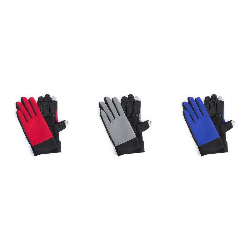 Par de guantes deportivos fabricados en resistente poliéster y licra. En diseño bicolor, con base en negro y detalles a color. Agarre en palma y función táctil en dedos índice y pulgar. Talla única para adultos.