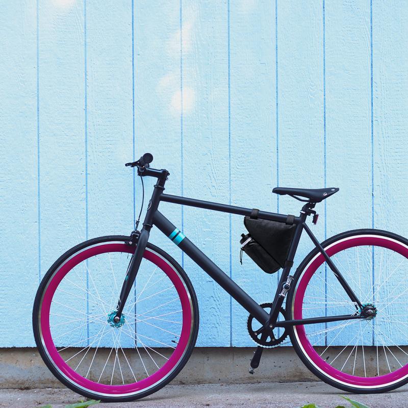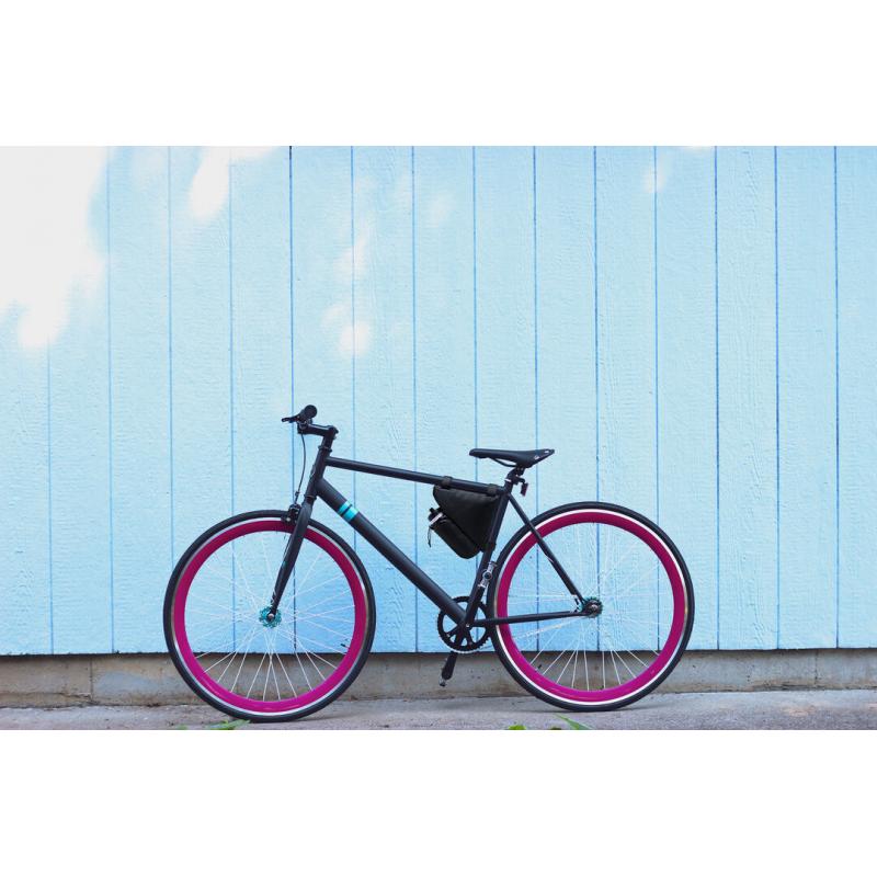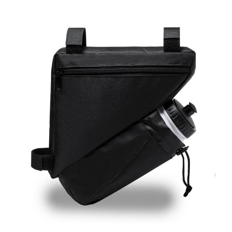 Bolsa para de bicicleta en resistente poliéster 600D con interior reforzado en PVC. Disponible en color negro. Compartimento principal con cierre de cremallera y ajuste universal al cuadro de la bicicleta mediante 3 tiras de velcro. Compartimento para bidón con cordón ajustable.