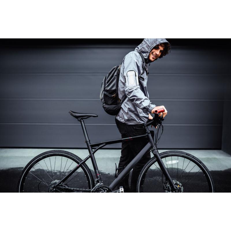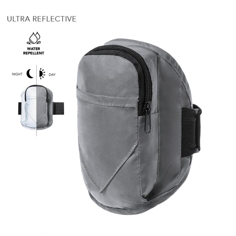 Brazalete deportivo en poliéster 210T, fabricado empleando tejido con gran capacidad para reflejar intensamente la luz, gracias a millones de pigmentos reflectantes y basándose en el principio de la retro-reflexión de la luz, una propiedad de visibilidad nocturna que consiste en la refracción de la luz hacia la fuente de origen de la misma. Bolsillo principal con cierre de cremallera y bolsillo frontal con cierre de velcro. Con tira ajustable elástica y resistente al agua.