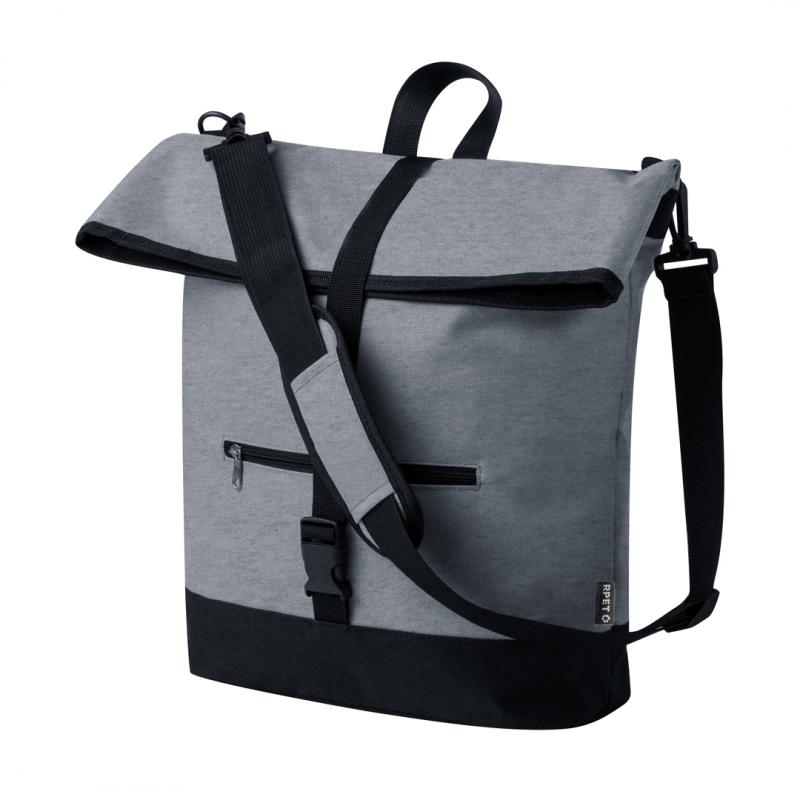 Bolsa bandolera para bicicleta fabricada en resistente RPET 600D. Versátil y con cierre de hebilla, incluye un práctico bolsillo frontal con cremallera. En su parte trasera cuenta con enganches específicos universales para bicicleta, garantizando una mayor comodidad y seguridad en los desplazamientos. Además, dispone de un asa bandolera acolchada y ajustable, para así transportarla con mayor confort cuando se desacopla de la bicicleta. Etiqueta exterior con logotipo RPET. El material RPET se elabora a partir de plástico reciclado, para así fomentar la reutilización de residuos plásticos y ayudar a la sostenibilidad del planeta.