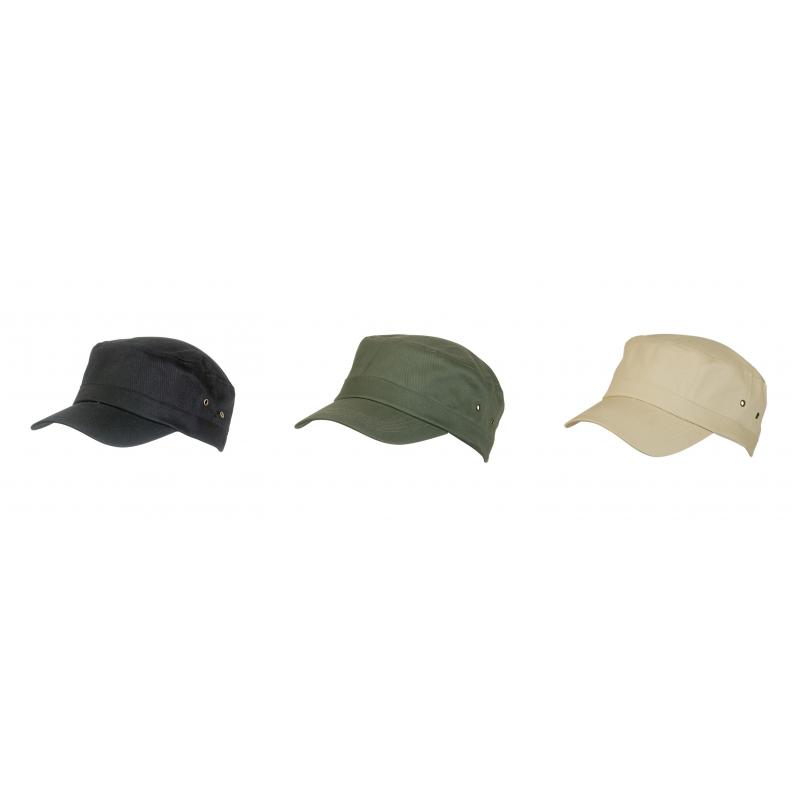 Gorra tipo militar en material 100% algodón peinado y sobrios colores. Con orificios de ventilación laterales reforzados con argolla metálicas y cierre ajustable de velcro.
